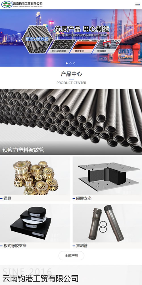 云南钧港工贸有限公司2016年创立于昆明,是一家专业从事公路桥梁、隧道、水利等工程配套使用的相应材料生产制造厂家,也是国内预应力、橡胶行业中的新起之秀,工艺技术成熟,产品质量可靠,专注制造预应力波纹管(预应力塑料波纹管/预应力金属波纹管)、桥梁伸缩缝、梁板式橡胶支座、工作锚具、钢绞线、铸铁泄水管、超声波检测管、橡胶缓冲垫块系列产品。